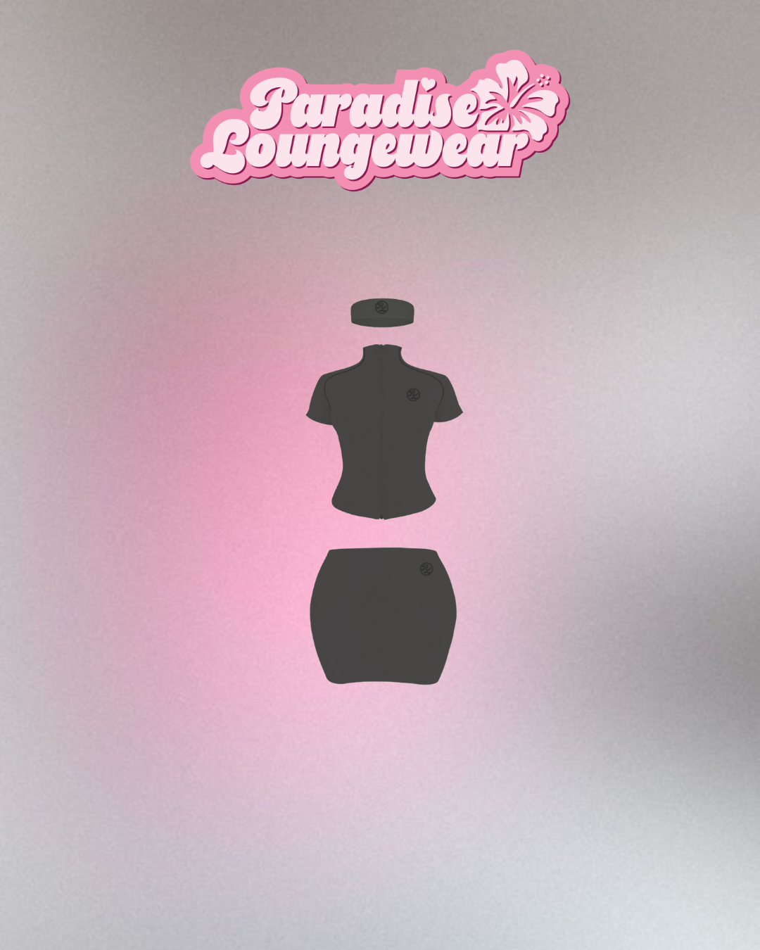 3 Piece Dark Grey skirt set! Comes with Zip up top, mini skirt and headband. This set is true to size and has stretchy breathable material.